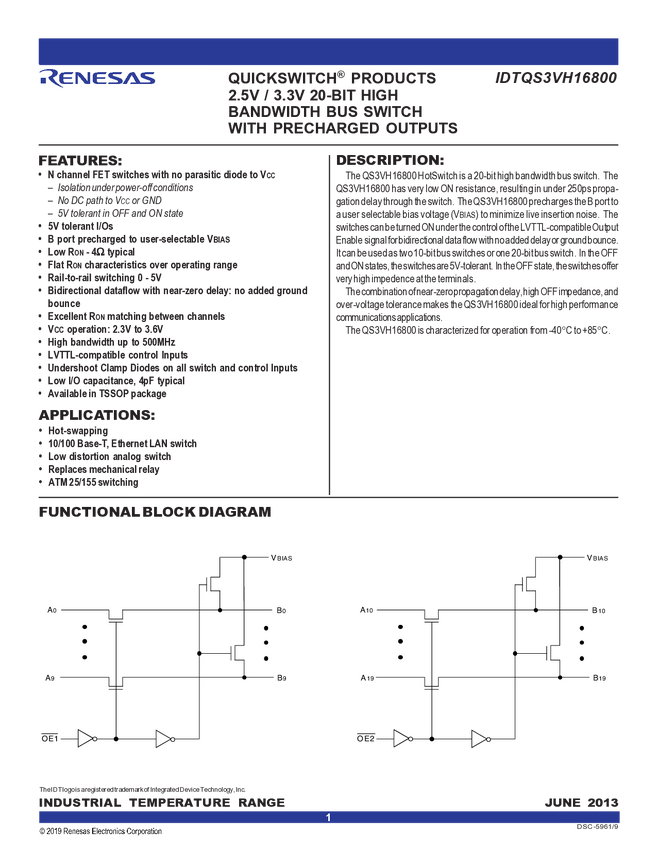 2.5V/3.3V 20-Bit High Bandwidth Bus Switch with Precharged Outputs