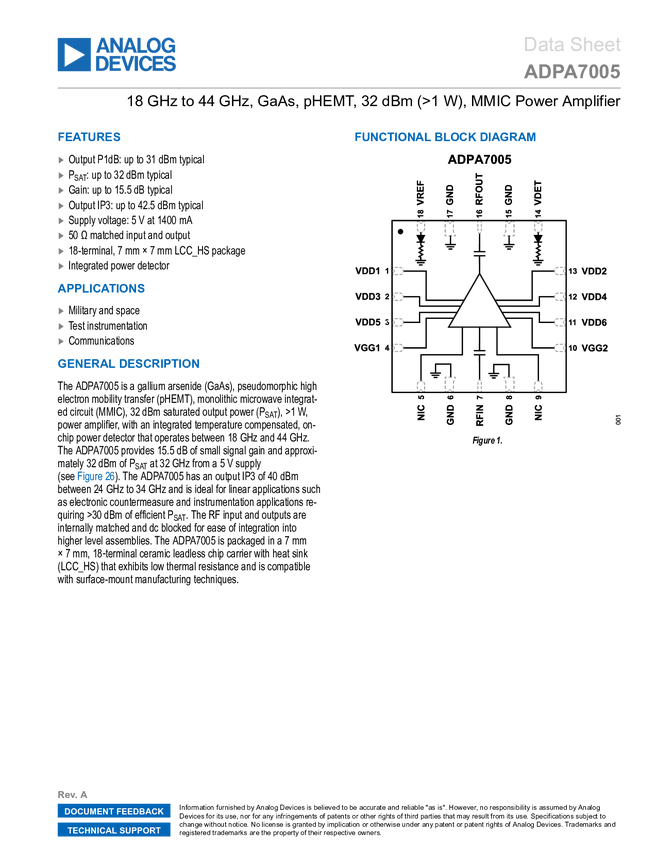 ADPA7005 18 GHz to 44 GHz, GaAs, pHEMT, 32 dBm (>1 W), MMIC Power Amplifier