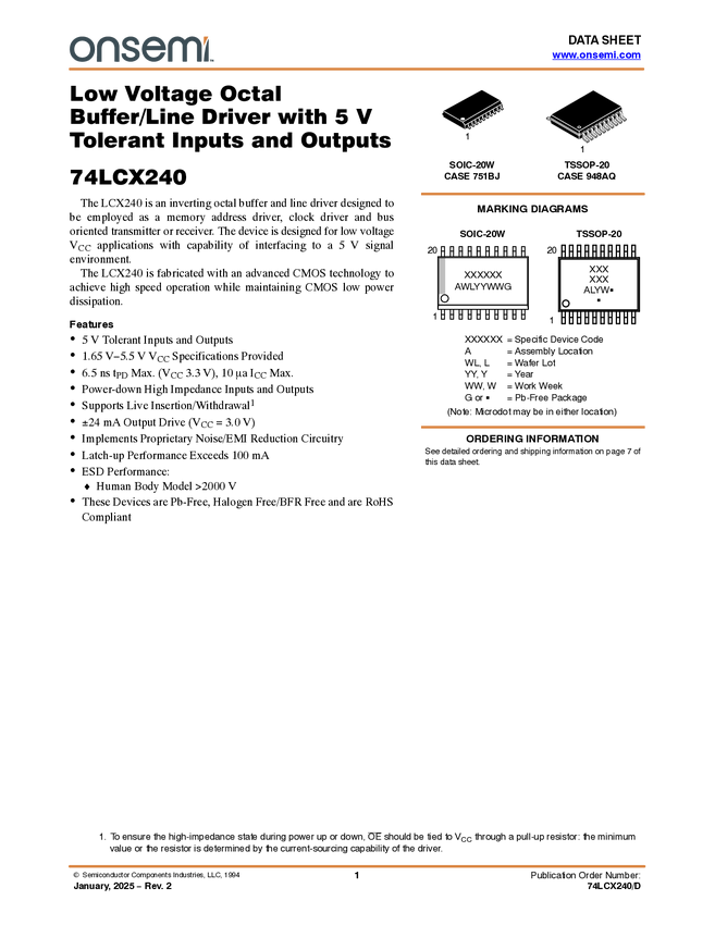 74LCX240 Low Voltage Octal Buffer/Line Driver with 5V Tolerant Inputs and Outputs