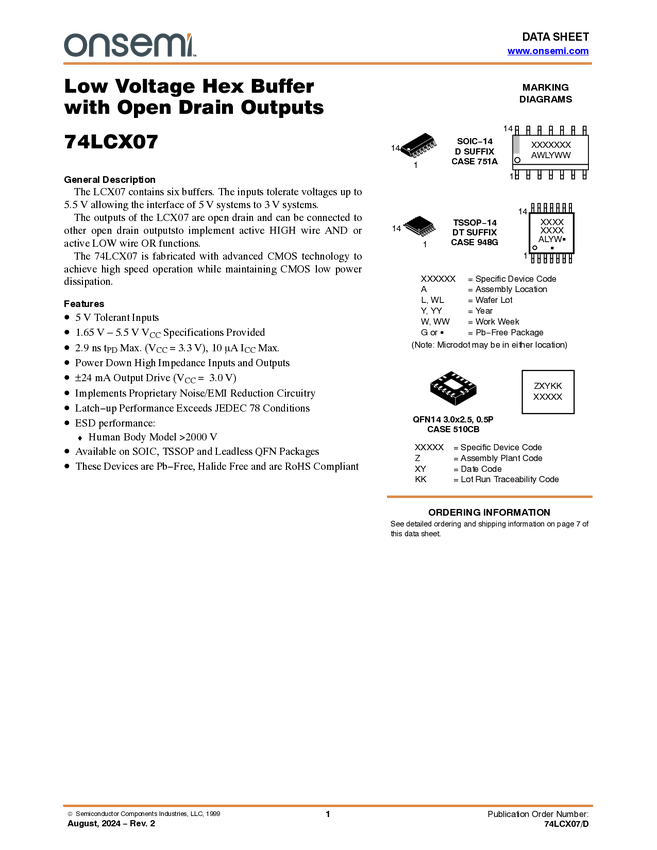 74LCX07 Low Voltage Hex Buffer with Open Drain Outputs