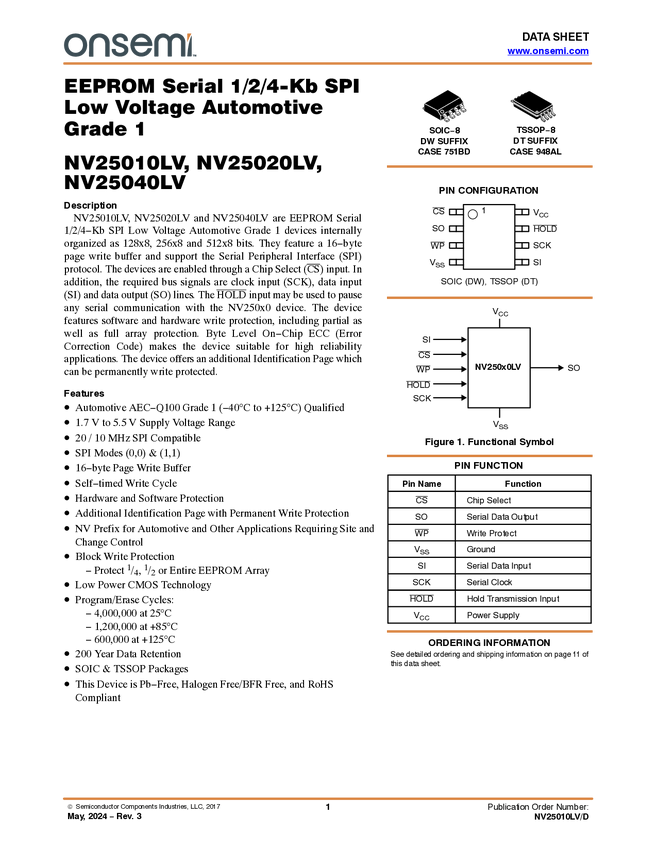 NV25040LV EEPROM Serial 4-Kb SPI - Automotive Grade 1 (+125°C)