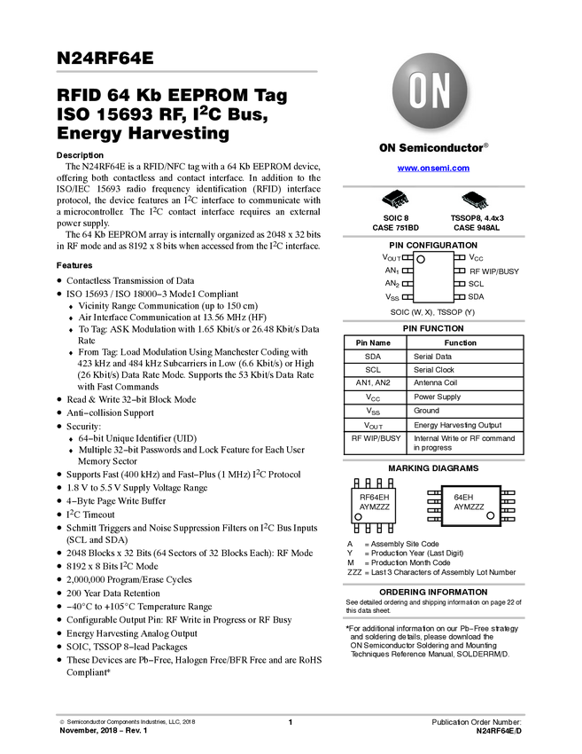 N24RF64E Dual Interface RFID 64 Kb EEPROM Tag ISO 15693 RF, I2C Bus, Energy Harvesti...