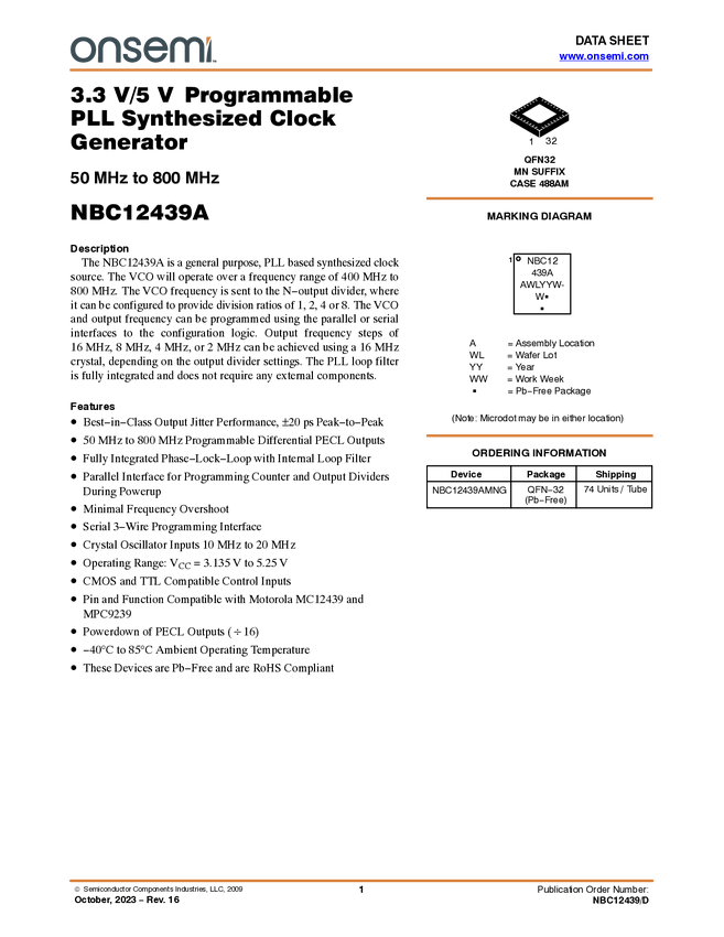 NBC12439 PLL Clock Generator, Synthesized, Programmable, 3.3 V / 5.0 V, with Power D...