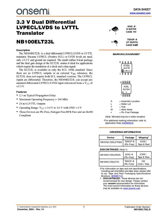 NB100ELT23L Translator, Dual Differential LVPECL to LVTTL
