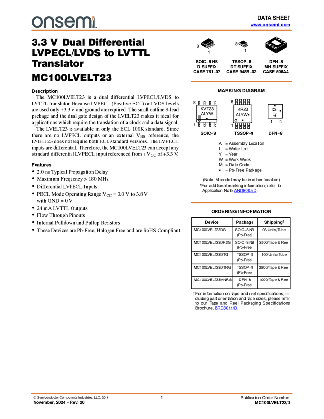 MC100LVELT23 Translator, Dual Differential LVPECL to LVTTL