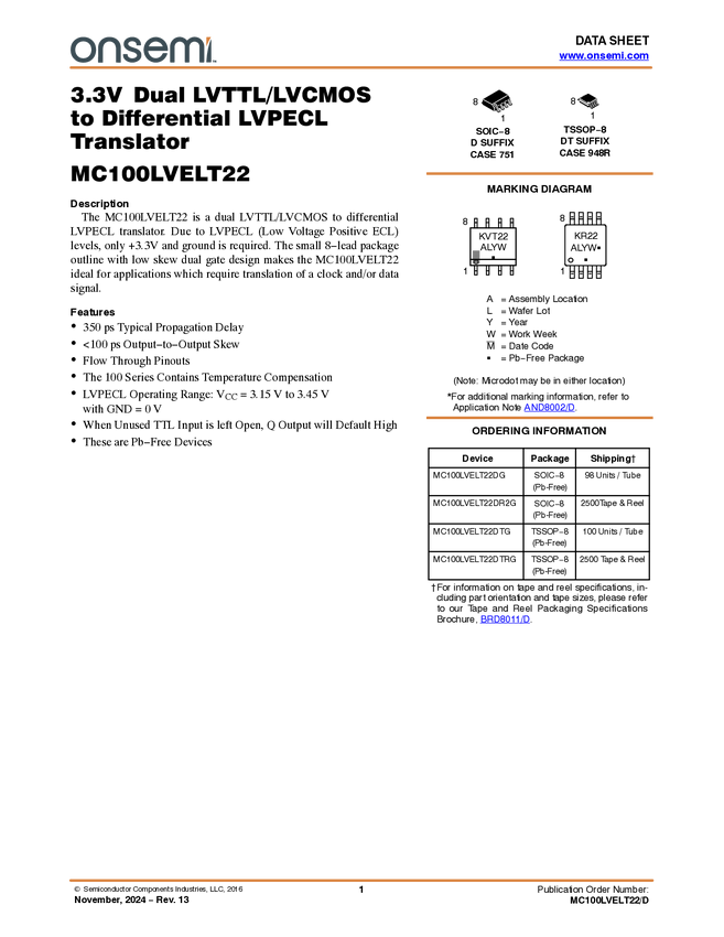 MC100LVELT22 Translator, Dual LVTTL / LVCMOS to Differential LVPECL