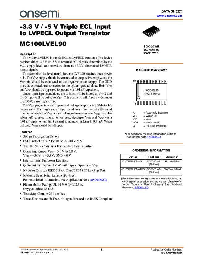 MC100LVEL90 Translator, Triple ECL Input to LVPECL Output