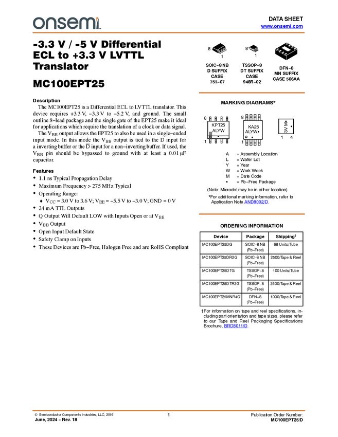 MC100EPT25 Translator, Differential LVECL / ECL to LVTTL