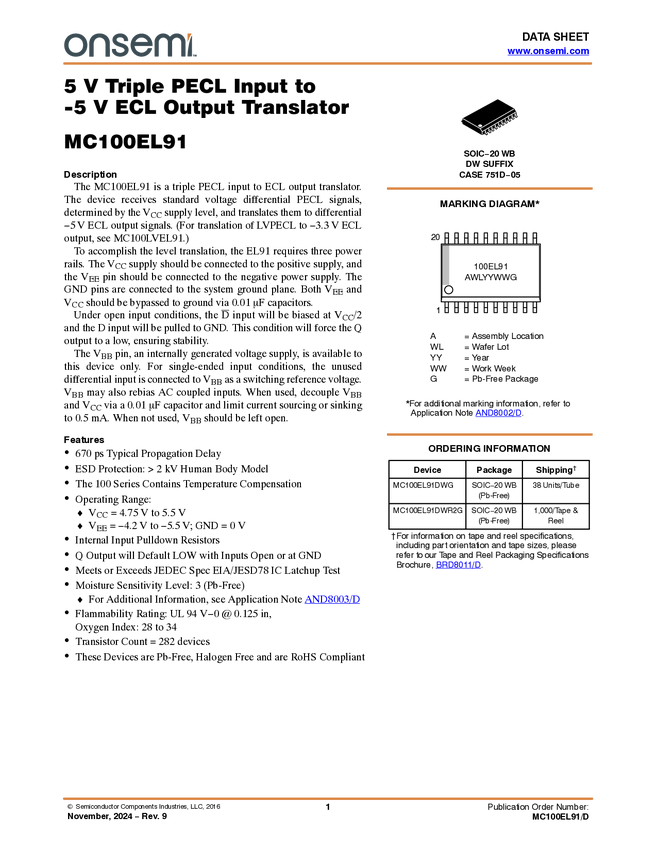 MC100EL91 Triple LVPECL/PECL Input to -5.0 V ECL Output Translator