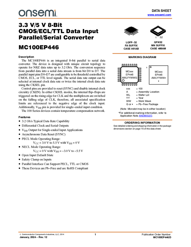 MC100EP446 Serial to Parallel Converter, 3.3 V / 5 V, 8-Bit, CMOS / ECL / TTL Data Inp...