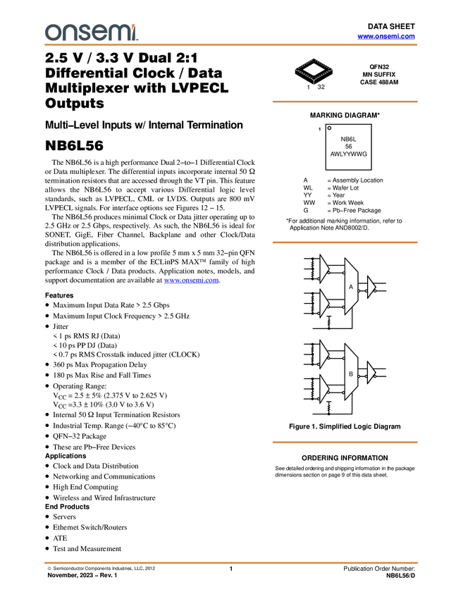 NB6L56 Clock / Data Multiplexer, 2.5 V / 3.3 V Dual 2:1 Differential, with LVPECL...