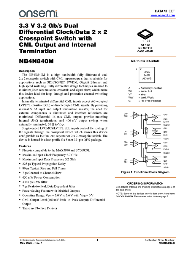 NB4N840M 2 x 2 Crosspoint Switch, Dual, 3.3 V, 3.2 Gb / s, with CML Outputs