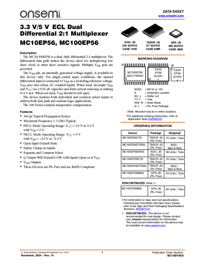 MC100EP56 Multiplexer, 2:1 Differential, Dual ECL, 3.3 V / 5.0 V