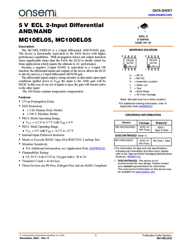 MC10EL05 5.0 V ECL 2-Input Differential AND/NAND Gate