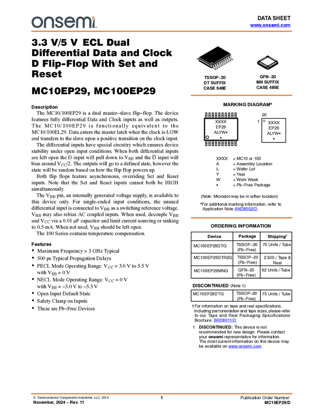 MC100EP29 ECL Dual Differential Clock/Data D Flip-Flop With Set and Reset