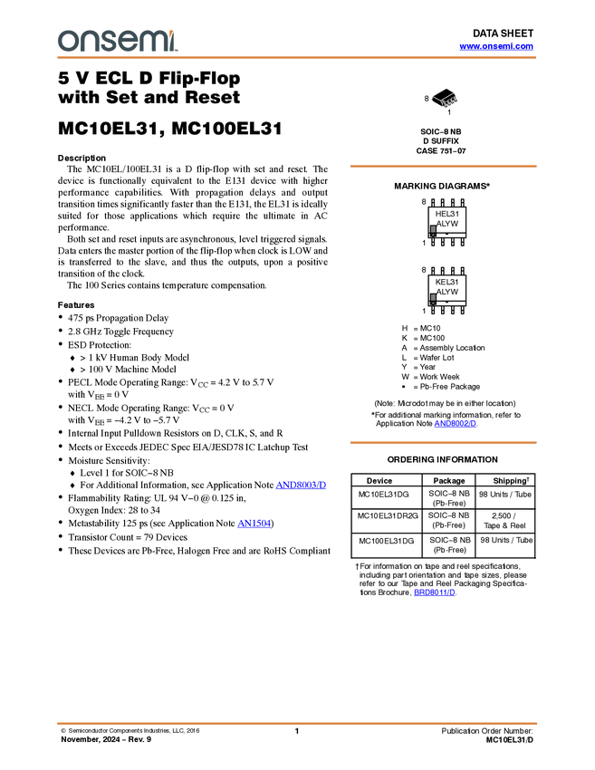 MC100EL31 5.0 V ECL D Flip-Flop with Set and Reset