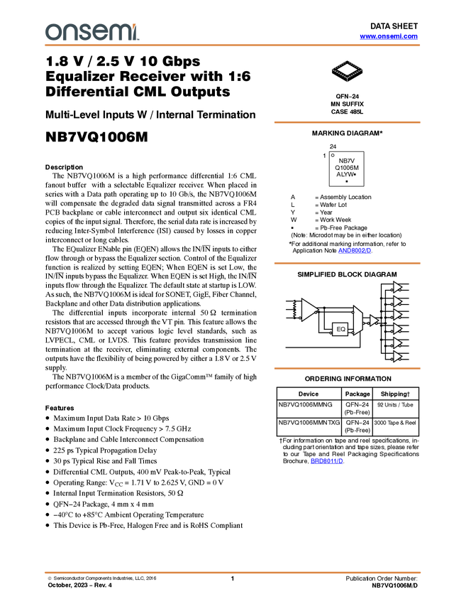NB7VQ1006M Fanout Buffer, Equalizer Receiver, 10 Gbps, 1.8 V / 2.5 V, with 1:6 Differe...