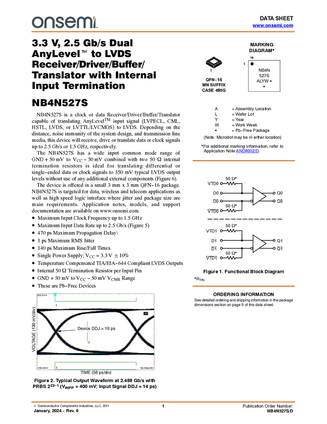 NB4N527S Translator, 3.3 V, 2.5 Gb/s Dual AnyLevel™ to LVDS Receiver/Driver/Bu...