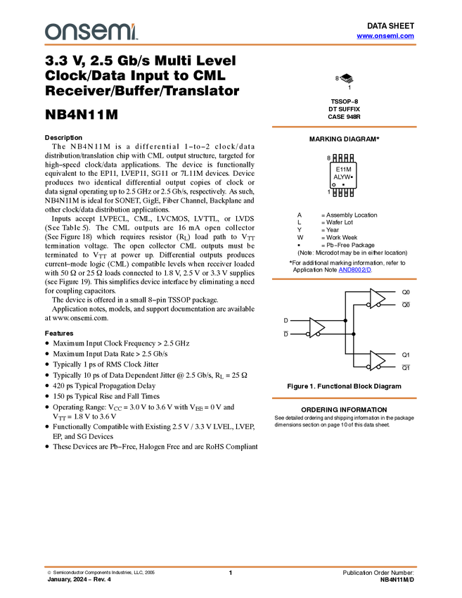 NB4N11M Multi Level Clock / Data Input to CML Receiver / Buffer / Translator, 2.5 G...