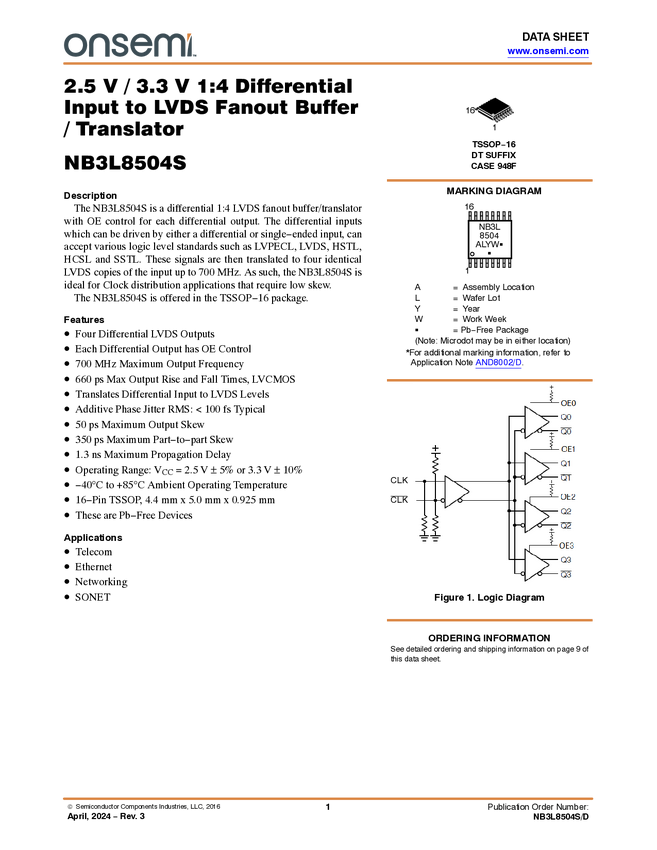 NB3L8504S 2.5 V / 3.3 V 1:4 Differential Input to LVDS Fanout Buffer / Translator