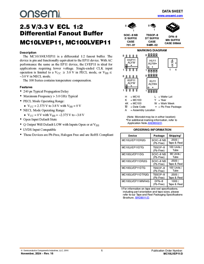 MC10LVEP11 Clock / Data Fanout Buffer, 1:2 Differential, ECL, 2.5 V / 3.3 V