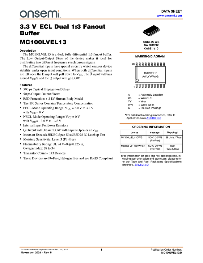 MC100LVEL13 Clock / Data Fanout Buffer, 1:3 Differential, Dual ECL, 3.3 V