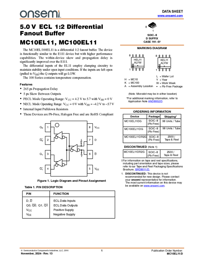 MC100EL11 Clock / Data Fanout Buffer, 1:2 Differential, ECL, 5.0 V