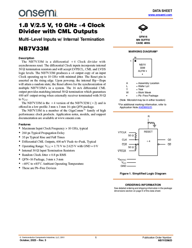 NB7V33M Clock Divider, ÷4, 10 GHz, 1.8 V / 2.5 V, with CML Outputs