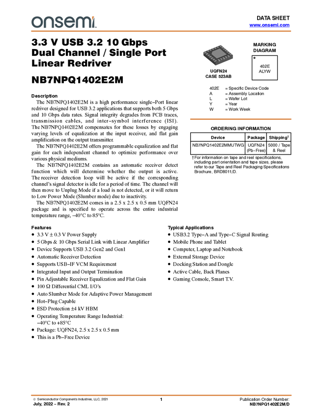 NB7NPQ1402E2M 3.3 V USB 3.2 10 Gbps Dual Channel / Single Port Linear Redriver