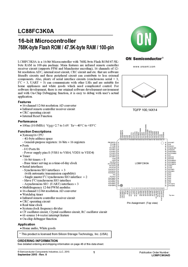 LC88FC3K0A 16-bit Microcontroller with 768K-byte Flash ROM and 47.5K-byte RAM, 100-pin