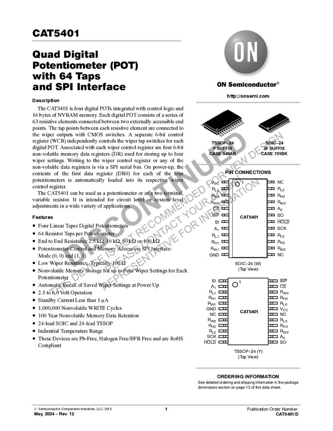 CAT5401 Digital Potentiometer (POT), Quad 64-Tap, with SPI Interface