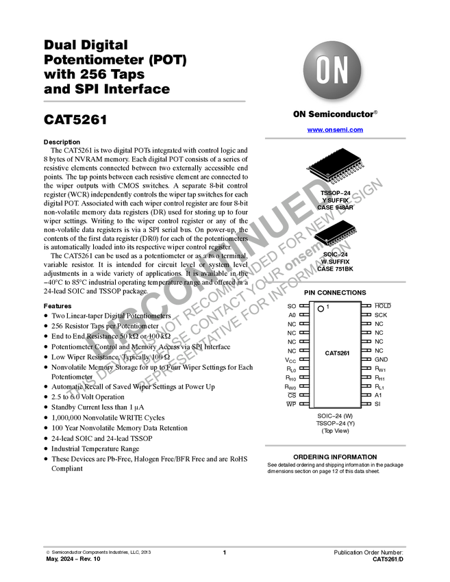 CAT5261 Digital Potentiometer (POT), Dual 256-Tap, with SPI Interface