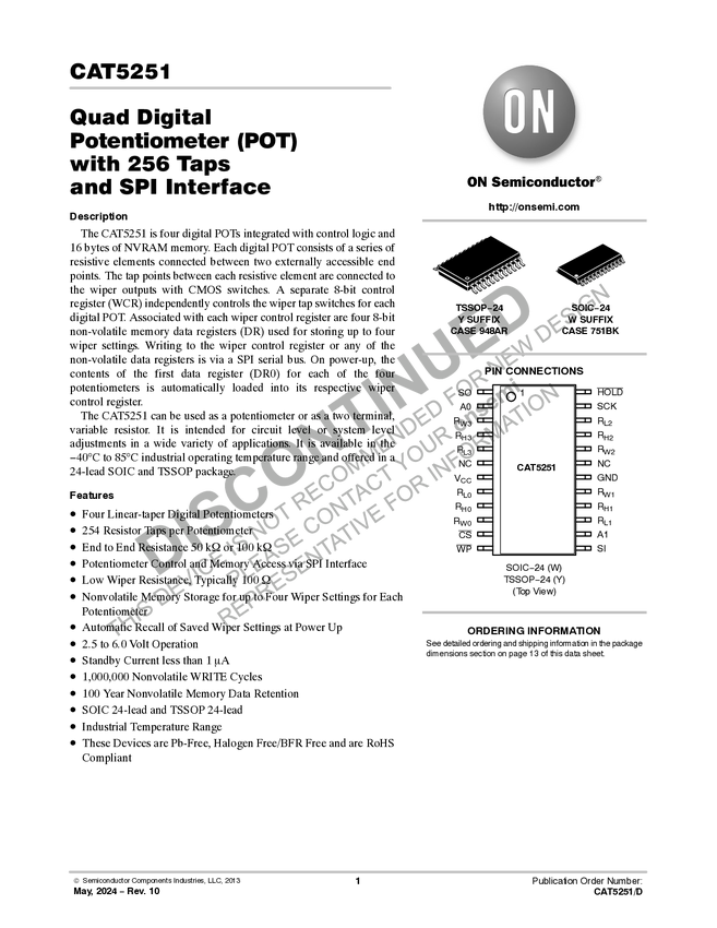 CAT5251 Digital Potentiometer (POT), Quad 256-Tap, with SPI Interface