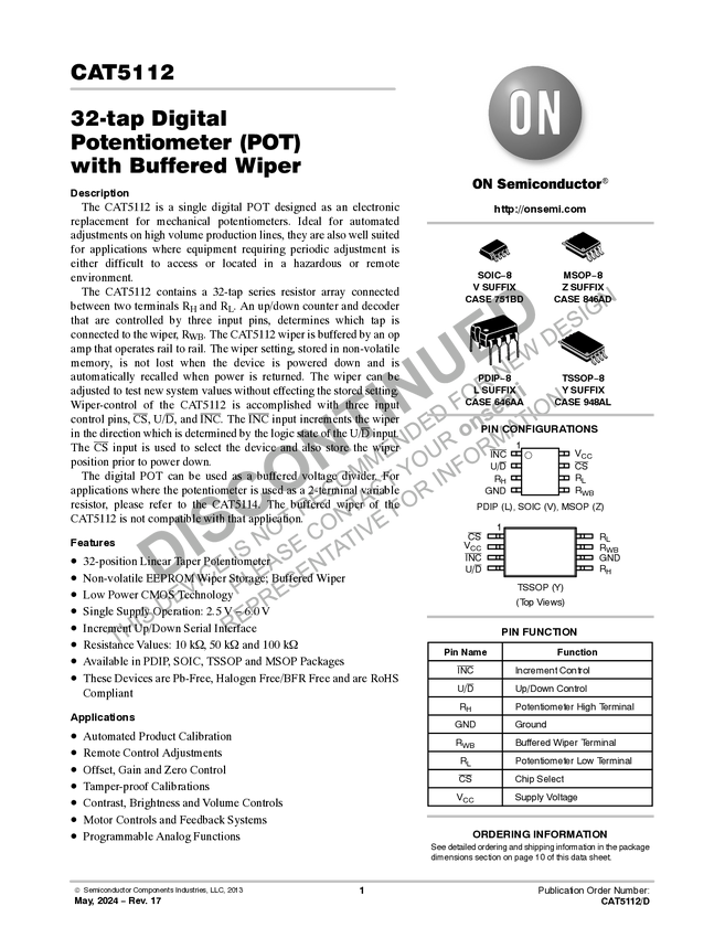 CAT5112 Digital Potentiometer (POT), 32-Tap, with Buffered Wiper