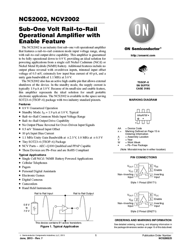 NCS2002 Operational Amplifier with sub-one volt operation, Rail to Rail I/O