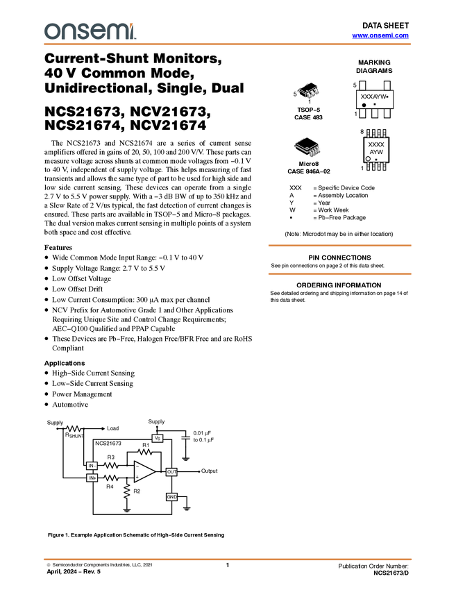 NCS21673 Current-Shunt Monitors, 40 V Common Mode, Unidirectional, Dual Channel