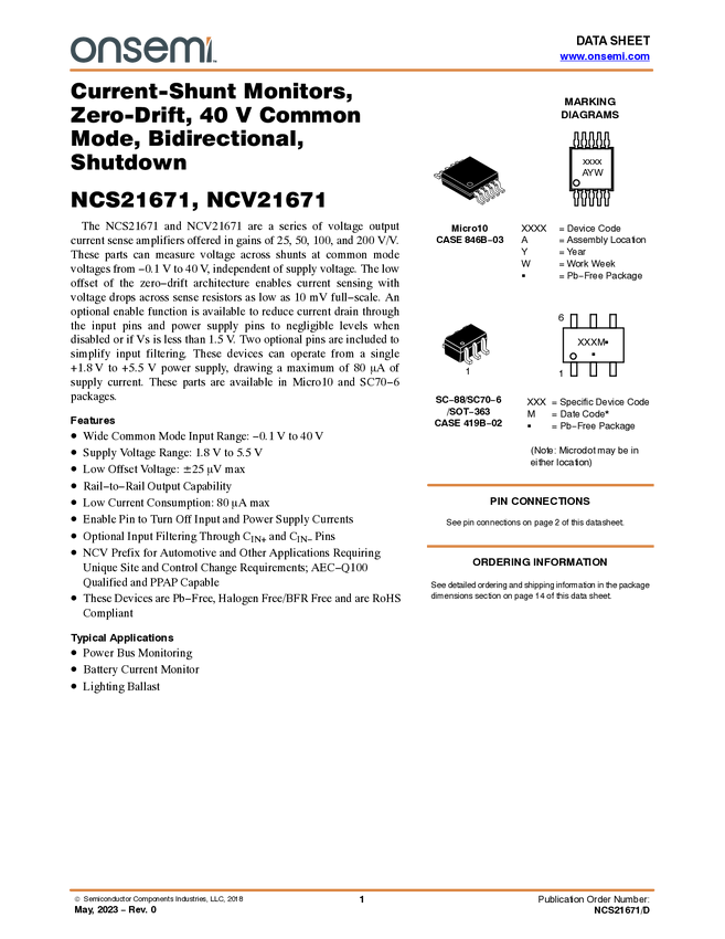 NCS21671 Current-Shunt Monitors, Zero-Drift, 40 V Common Mode, Bidirectional, Shutdo...