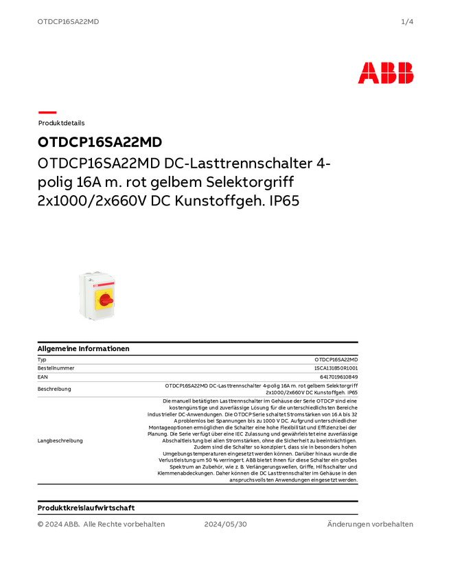 1SCA131850R1001 ABB 1SCA131850R1001 Rozłącznik OTDCP16SA22MD, 1000 V, 16 A