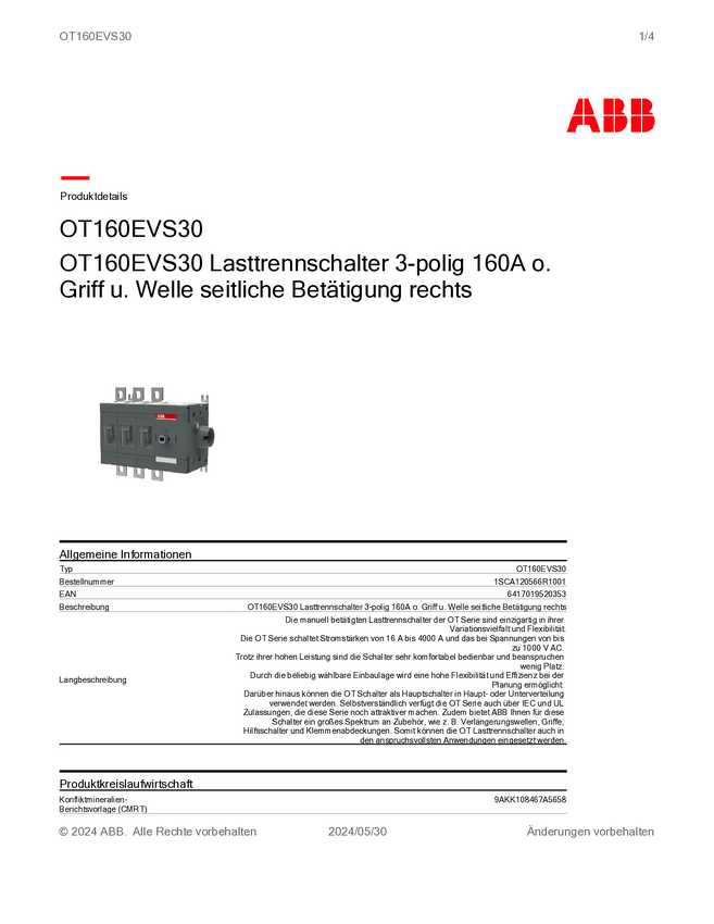 1SCA120566R1001 ABB OT160EVS30 Rozłącznik 160 A 1000 V 1 szt.