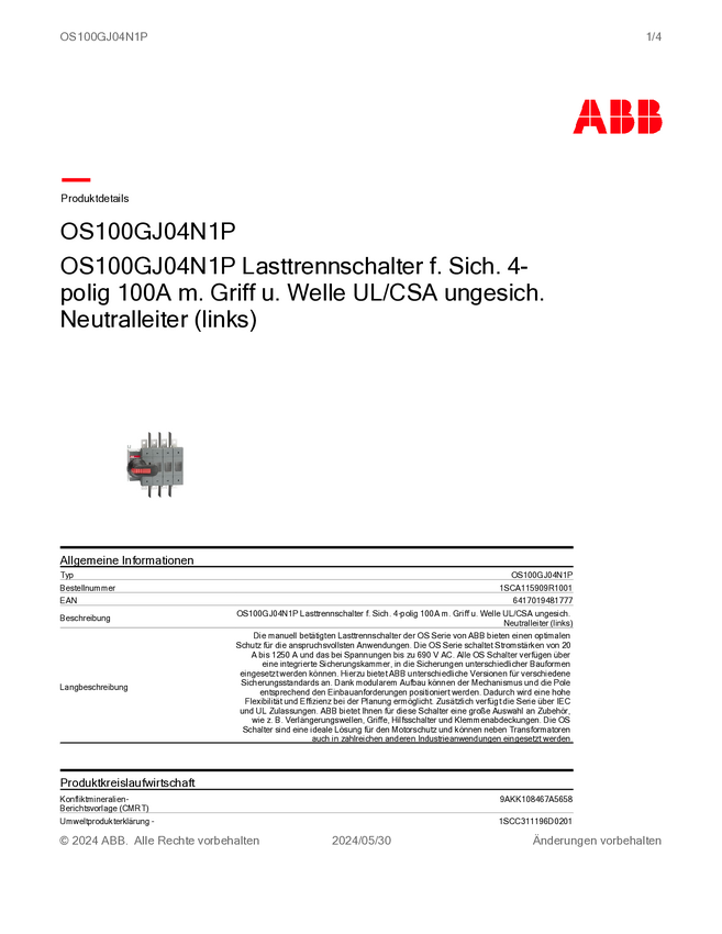 1SCA115909R1001 ABB 1SCA115909R1001 Rozłącznik OS100GJ04N1P, 160 A