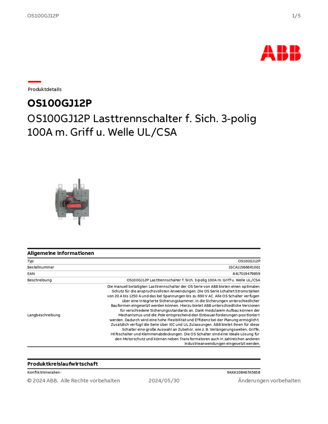 1SCA115666R1001 ABB OS100GJ12P Rozłącznik 160 A 1 szt.