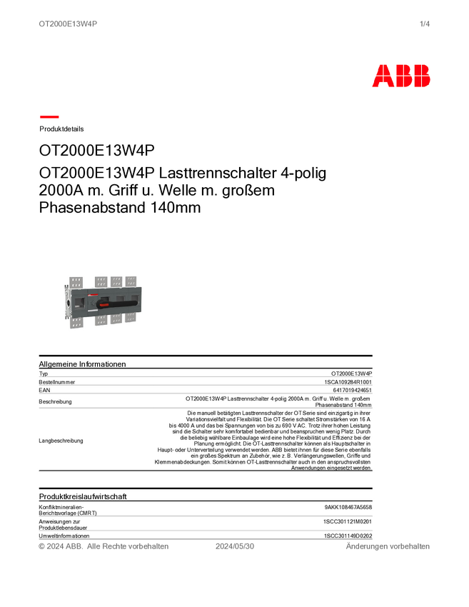 1SCA109284R1001 ABB 1SCA109284R1001 Rozłącznik OT2000E13W4P, 1000 V, 2000 A