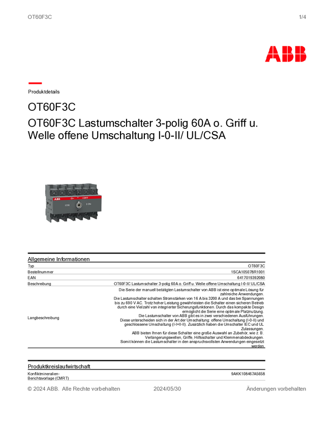 1SCA105078R1001 ABB 1SCA105078R1001 Przełącznik zmiany kierunku OT60F3C, 750 V, 60 A