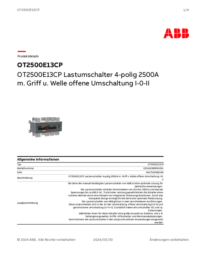 1SCA103895R1001 ABB OT2500E13CP Przełącznik zmiany kierunku 2500 A 1000 V czarny 1 szt.