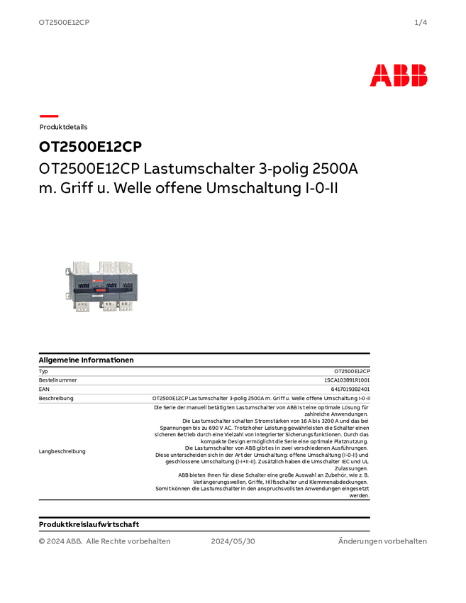 1SCA103891R1001 ABB OT2500E12CP Przełącznik zmiany kierunku 2500 A 1000 V czarny 1 szt.