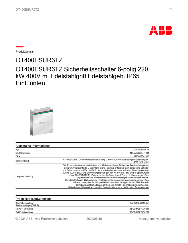 ABB OT400ESUR6TZ Wyłącznik bezpiecznikowy 400 A 1000 V szary 1 szt.