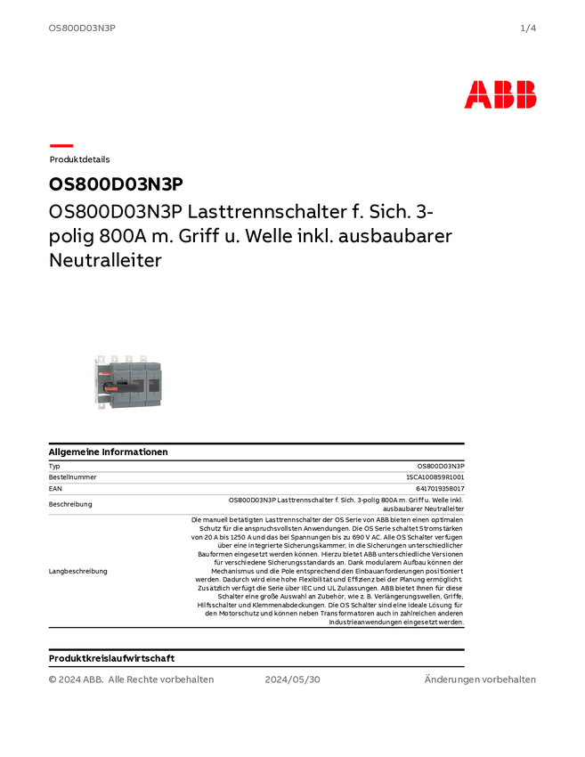 1SCA100859R1001 ABB OS800D03N3P Rozłącznik 720 A 1 szt.