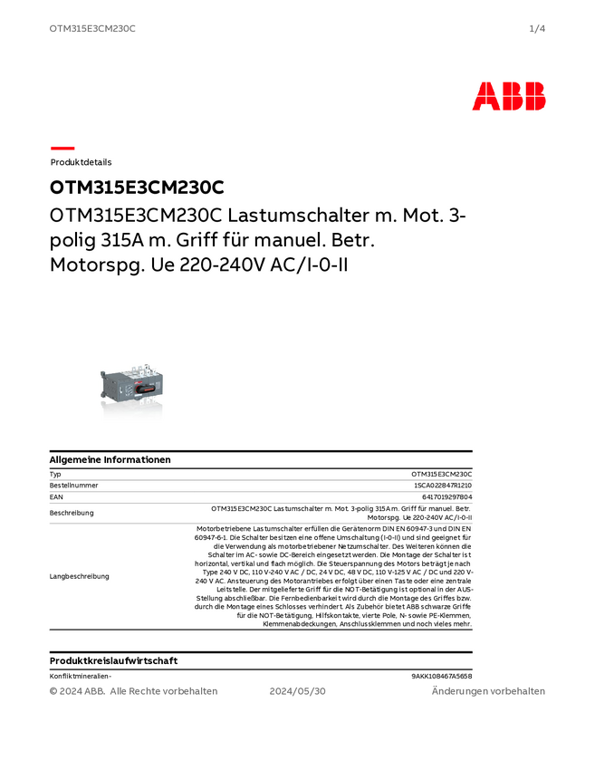 1SCA022847R1210 ABB OTM315E3CM230C Przełącznik zmiany kierunku 315 A 1000 V czarny 1 szt.