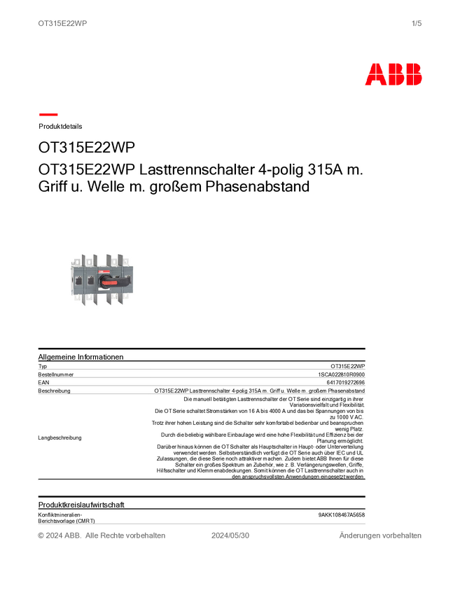 1SCA022810R0900 ABB 1SCA022810R0900 Rozłącznik OT315E22WP, 1000 V, 315 A
