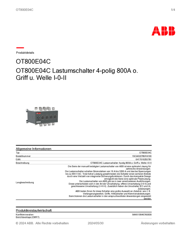 ABB OT800E04C Przełącznik zmiany kierunku 800 A 1000 V czarny 1 szt.